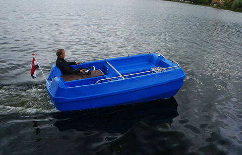 With an inox steering wheel and inox railing, the Belvedere Eco can be ordered in the colors blue, silver-grey or olive-green for recreational or rental use.