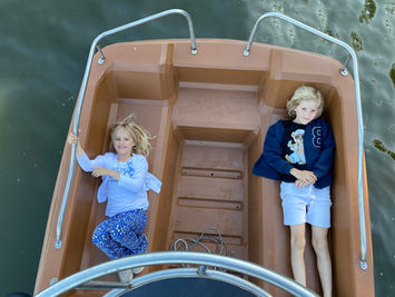 1) Dutch durable design; more stability (275kg) for 6 persons or 10 children; 2) Easy peddeling thanks to the innovative 'Da Vinci' waterwheel, with more trust and less effort; 3) Better steering action, with the double rudder; 4) Catamaran body, made of circulair PE material for 20 years lifetime, maximum stability and shockproof; 5) Ergonomic design for easy getting in and out at all sides, with ergonomic seats opposite of eachother, suitable for everybody, young and old; 6) Option for electric power assist, see the EV2 version.